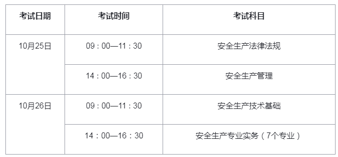 根据《人力资源社会保障部办公厅关于2025年度专业技术人员职业资格考试工作计划及有关事项的通知》,2025年中级注册安全工程师考试时间为10月25日、26日。考试分四个半天进行,各个科目的考试时长均为2.5小时,具体安排如下: