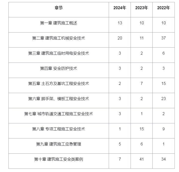 通过考情分析我们可以清晰的了解到建筑施工安全科目学习的重点是一、二章。根据其考察的分值占比进行了科学的学习权重配比,考生可以结合学习权重合理的分配每个章节的学习时间。