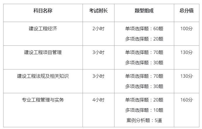 一级建造师考试共设四个科目,其中前三门为公共科目,最后一门为实务科目,不同科目的题型结构略有区别,具体如下: