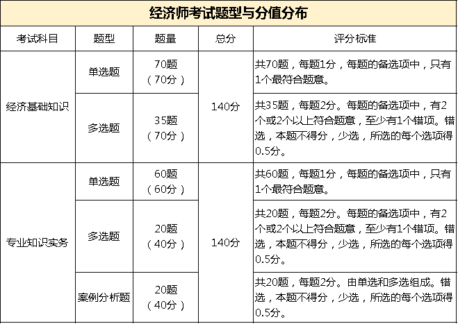 中级经济师的考试题型及分值分布汇总如下: