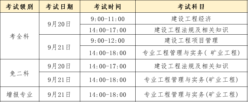其中,考全科的考生要考四个科目,分别为《建设工程经济》、《建设工程法规及相关知识》、《建设工程项目管理》和《专业工程管理与实务》(矿业工程)。