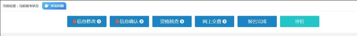(信息修改、信息确认、资格核查、网上交费、报名完成这5个按钮均呈现蓝色背景状态,且信息修改和信息确认已锁定,说明报名成功,安心备考即可。)