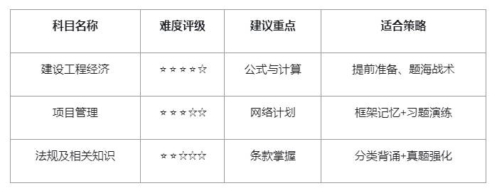 公共科目虽然难度不一,但都需通过才能获得成绩有效性。建议根据自身基础制定针对性复习策略,分阶段突破难点,尤其是对《建设工程经济》要多花时间打牢基础。
