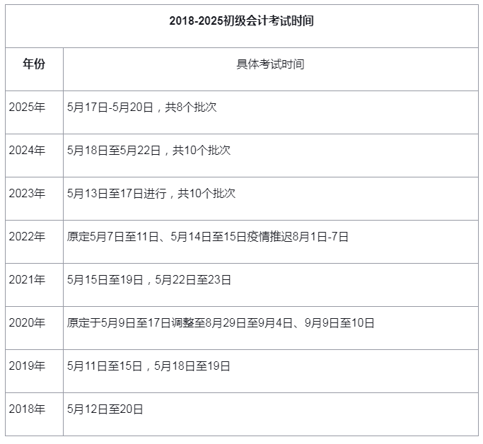 2026年辽宁初级会计考试时间预计在5月进行,小编整理2018年-2025年考试时间安排,供考生参考: