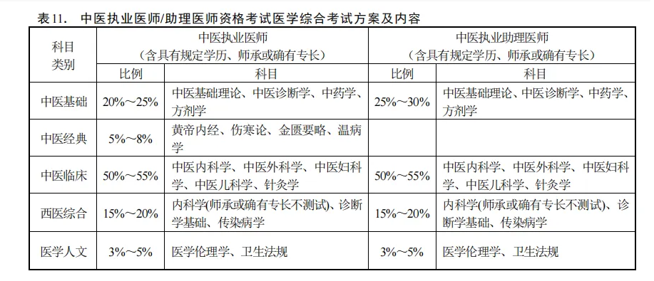中医临床:占比50%-55%,考试科目包括中医内科学、中医外科学、中医妇科学、中医儿科学、针灸学。