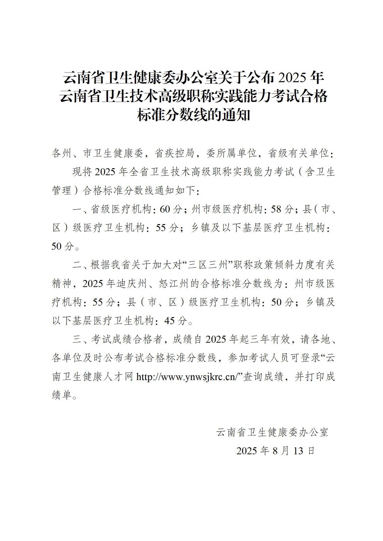 云南省卫生健康委办公室关于公布2025年云南省卫生技术高级职称实践能力考试合格标准分数线的通知