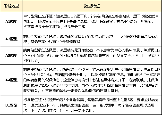 口腔执业医师医学综合部分分四个单元进行考试,考试一共考600道题,每单元各150道题,考试题型全部都是选择题,分为A1、A2、A3/A4、B1五种题型。不同题型特点来学网汇总如下: