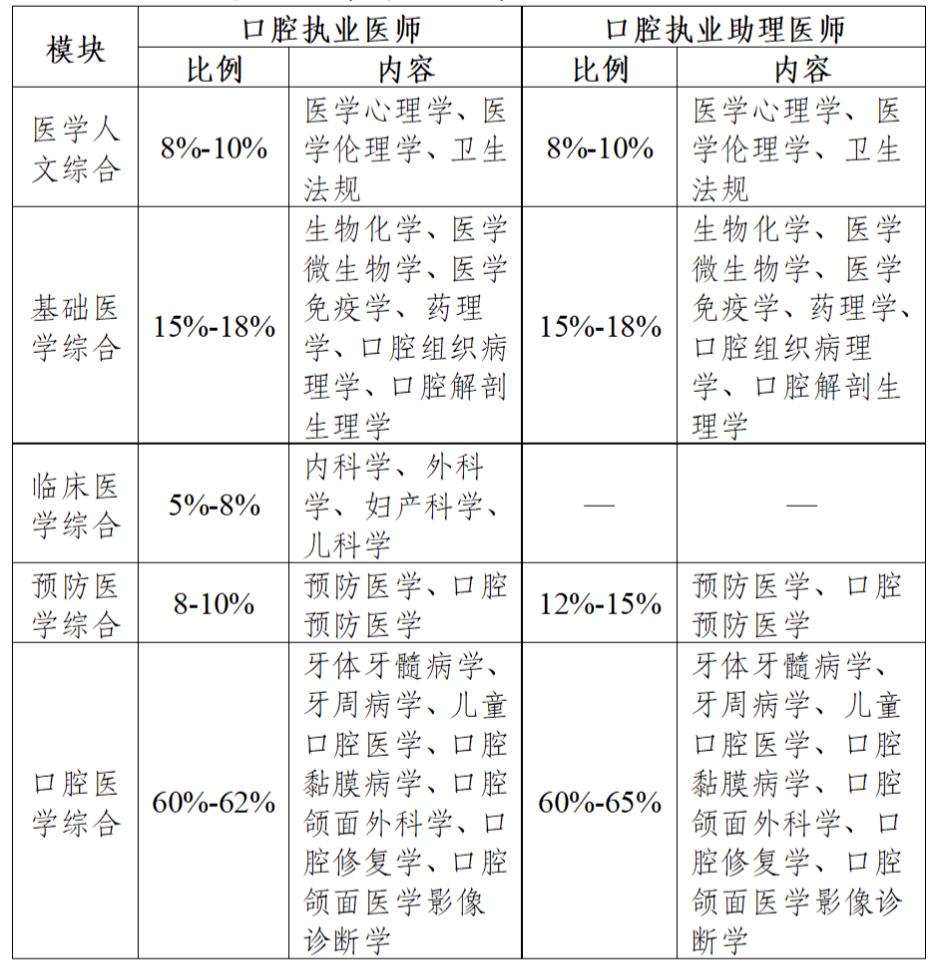 口腔医学综合:占比60%-62%,内容包括牙体牙髓病学、牙周病学、儿童口腔医学、口腔黏膜医学、口腔颌面外科学、口腔修复学、口腔颌面医学影像诊断学。