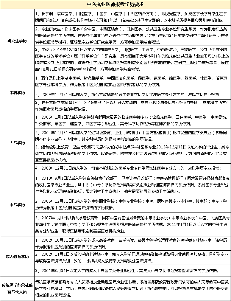 报考相应类别的医师资格,应当具备与其相一致的医学学历。根据《医师资格考试报名资格规定(2014版)》规定,报考中医执业医师的学历要求如下: