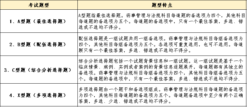 2025年西药执业药师考试将继续采用计算机化的考试形式,考试题型全部都为客观选择题。试题由两部分组成:一为题干,设定问题背景;二为选项,即备选答案。考生在设定的备选答案中选择正确的、符合题意的答案,不需作解释和论述。国家执业药师职业资格考试试题分A型题(最佳选择题)、B型题(配伍选择题)、C型题(综合分析选择题)和X型题(多项选择题)四种题型。不同考试题型的特点如下。