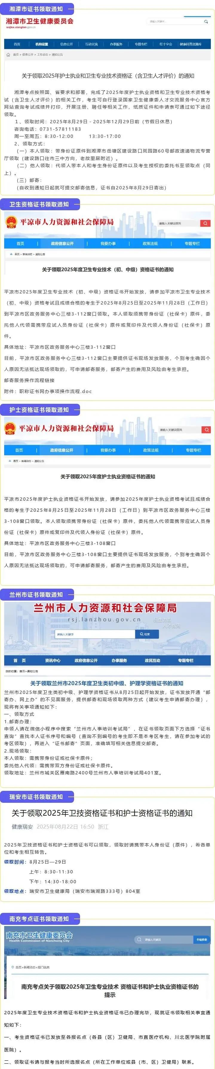 25年护士/卫生资格证书领取通知,新增湘潭/平凉/兰州/瑞安/南充