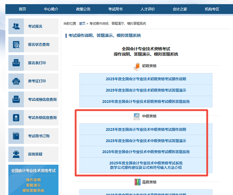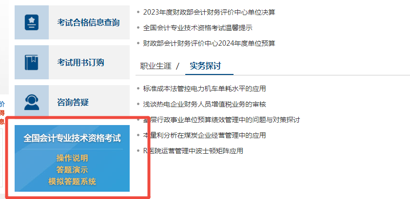 第一步,进入全国会计资格评价网,在左侧菜单栏找到“全国会计专业技术资格考试操作说明、答题演示、模拟答题系统”,点击进入。