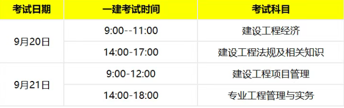 一级建造师考试为全国统考,原则上每年举行一次考试。2025年一级建造师考试时间确定为9月20日、21日,一建各科考试安排如下: