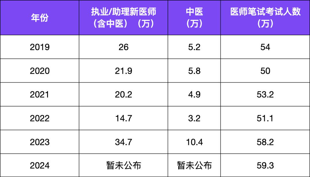 结合每年的新医师数量(估算)和考试人数,整体笔试通过率大约 30%~50% 左右