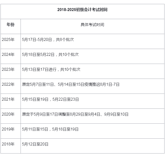 2026年初级会计考试时间预计在5月进行,小编整理近几年考试时间安排,供考生参考:
