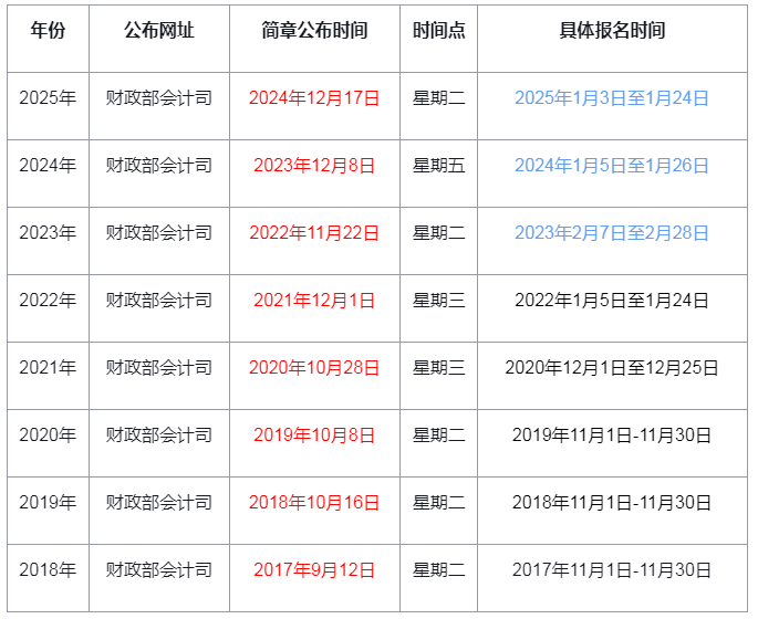 2026年度全国初级会计报名简章预计在2025年12月份公布,小编整理2018-2025年财政部关于初级会计报名简章公布时间数据,供考生参考: