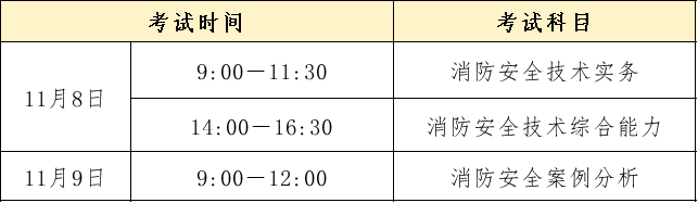 2025年一级注册消防工程师考试时间为11月8日、11月9日,各科目具体考试时间安排如下: