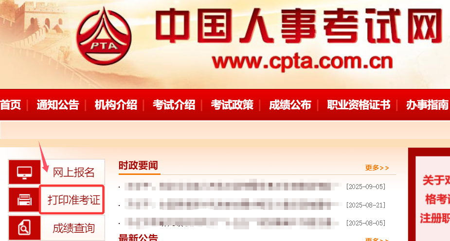 第一步:进入中国人事考试网,点击左侧“打印准考证”按钮。
