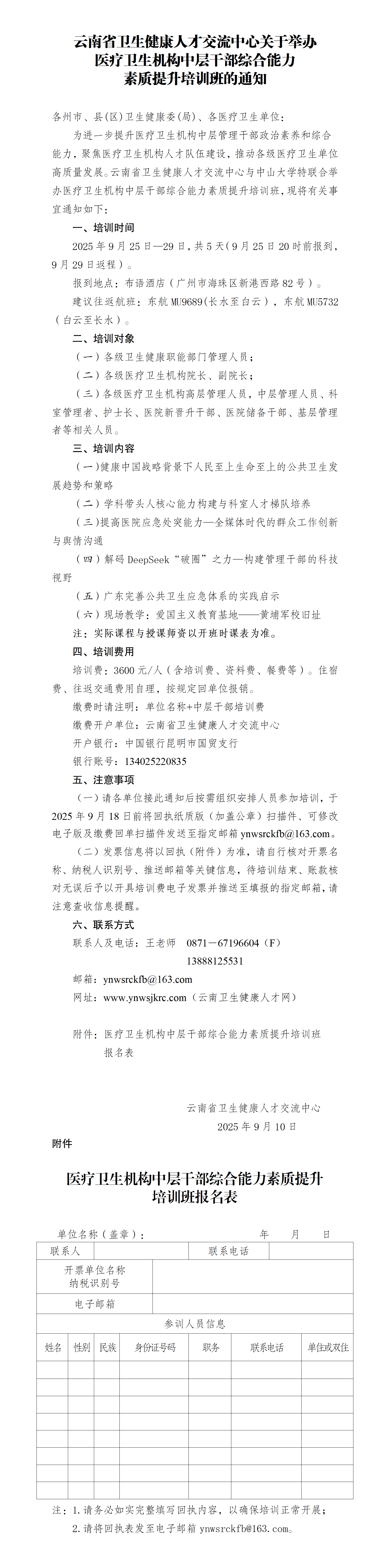 云南省卫生健康人才交流中心关于举办医疗卫生机构中层干部综合能力素质提升培训班的通知