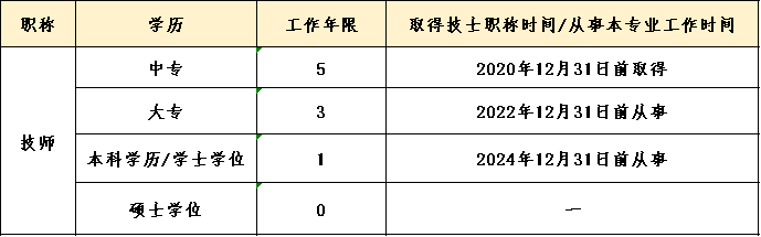 4、具备相应专业中专学历,取得技士职称后,从事本专业工作满5年。