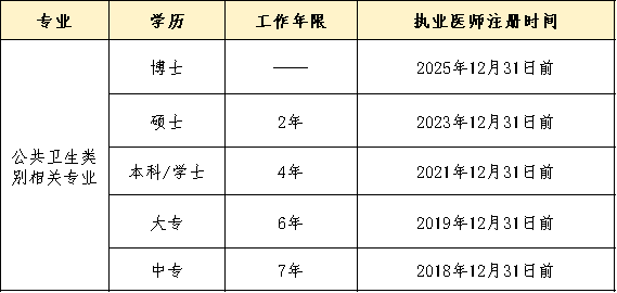 4、具备大专学历,经执业医师注册后从事公共卫生执业活动满6年;