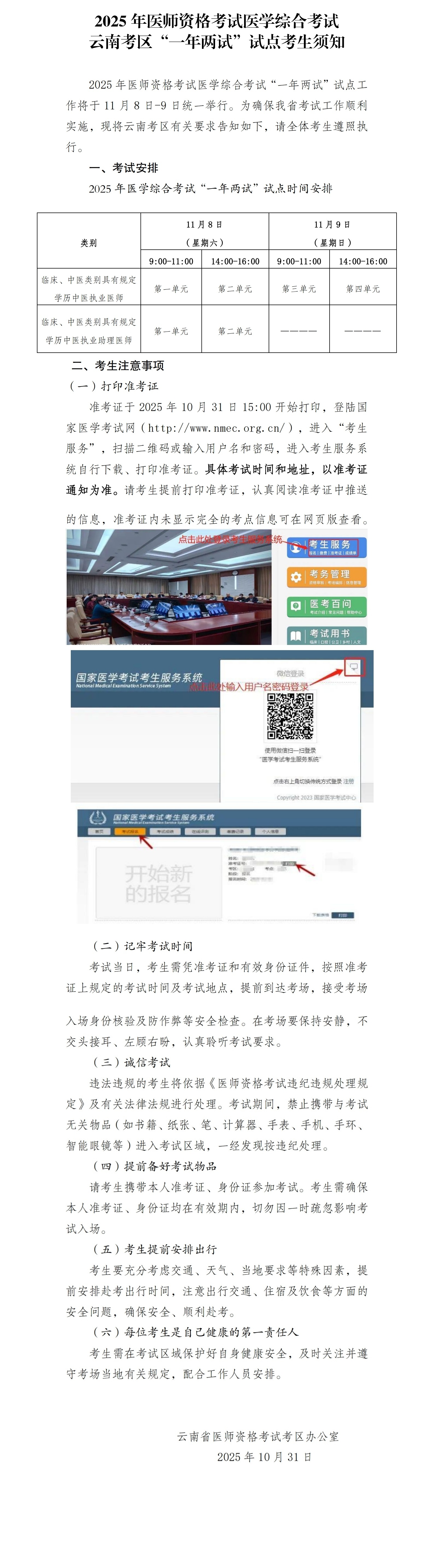2025年医师资格考试医学综合考试 云南考区“一年两试”试点考生须知