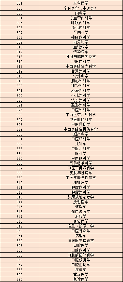 也就是说,主治医师和主管医师的考试专业为《卫生专业技术资格考试专业目录》中专业代码为301至365以及392专业。