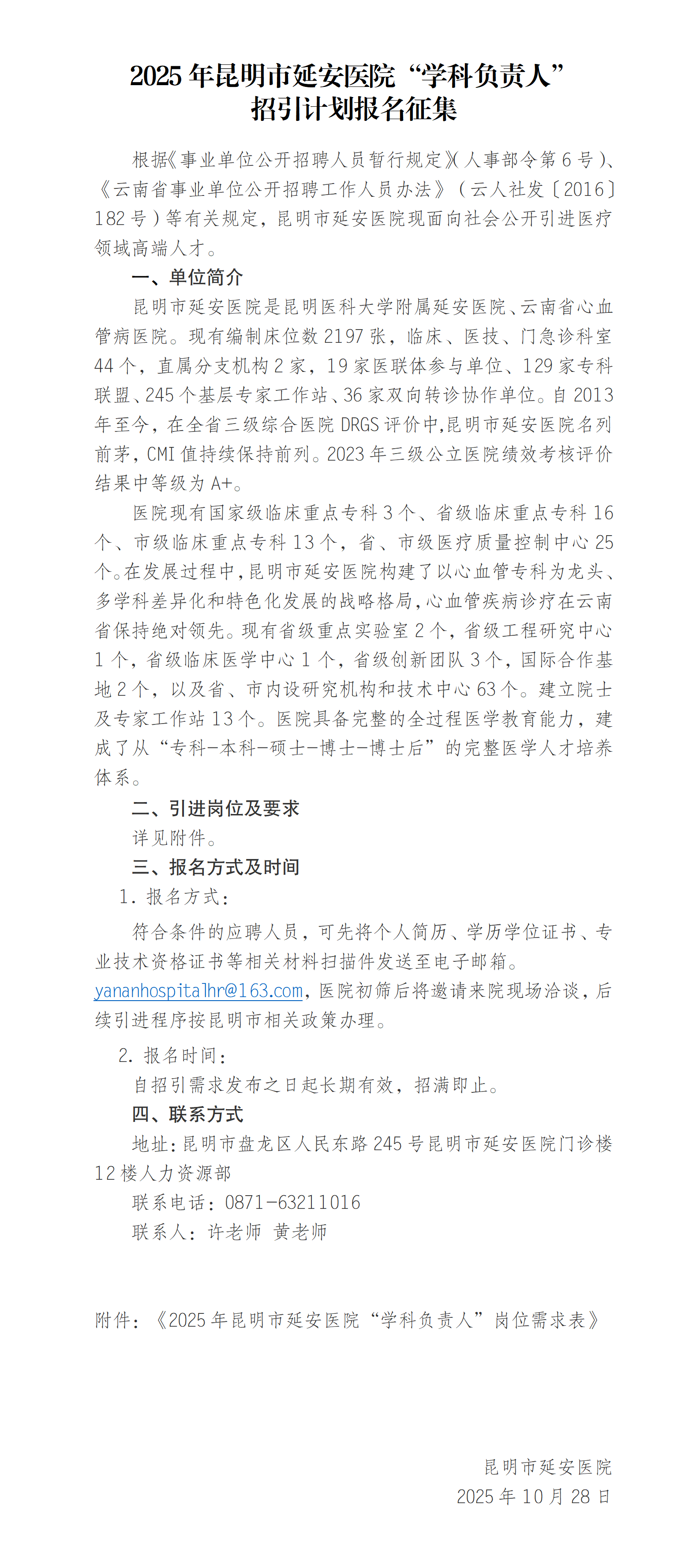 2025年昆明市延安医院“学科负责人”招引计划报名征集
