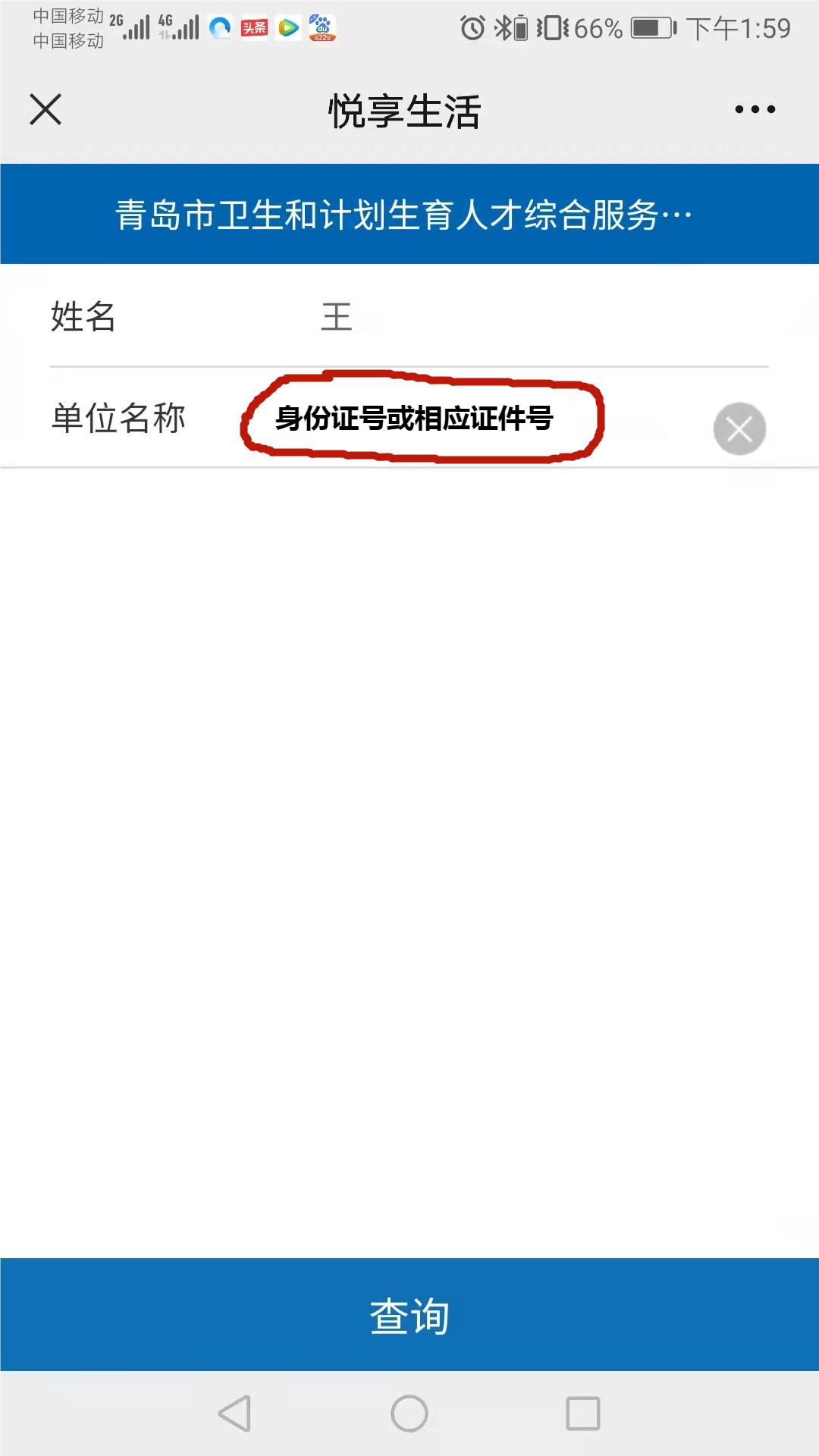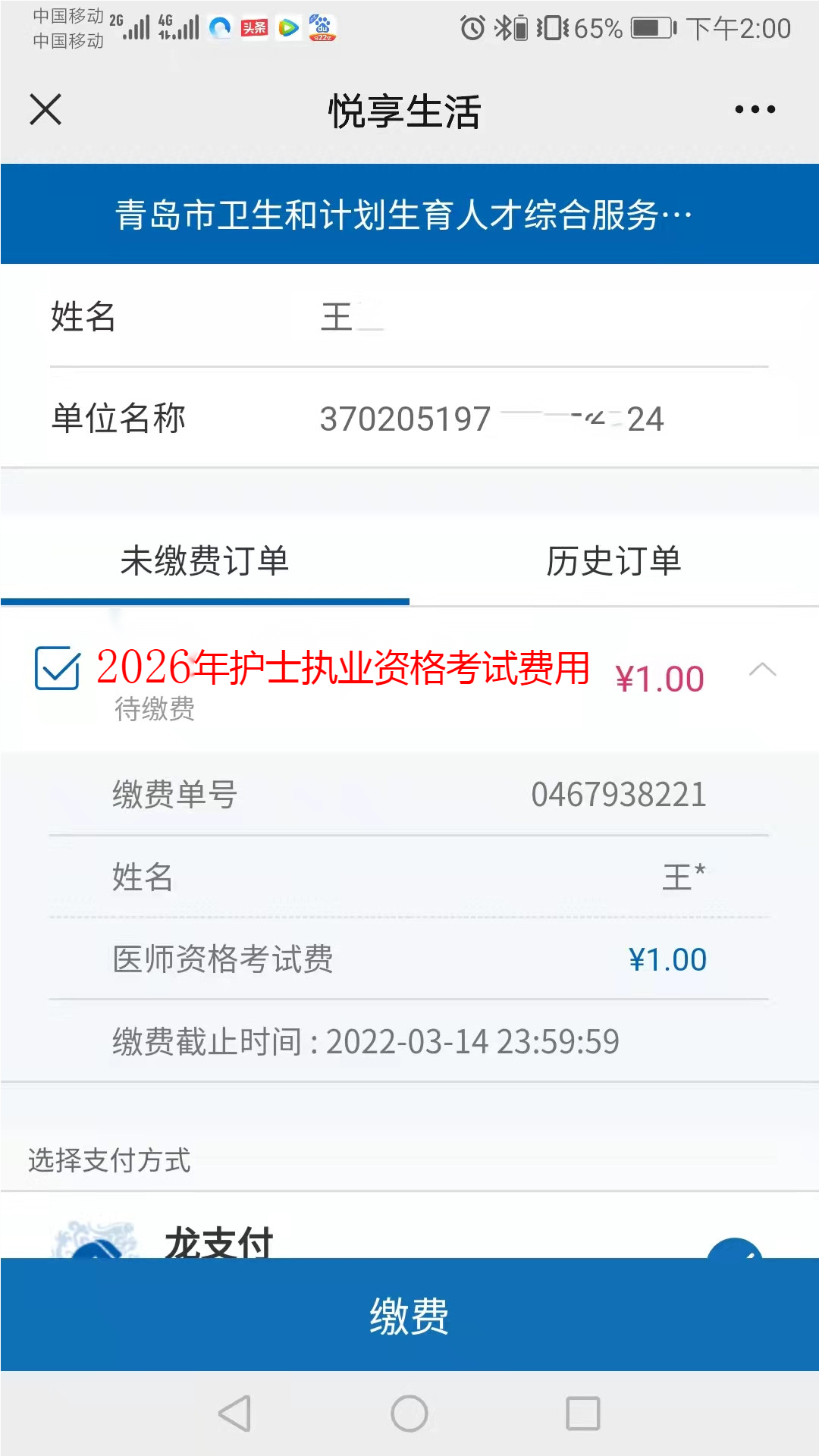 查询缴费单时,单位名称栏目务必请填“证件号码”,以居民身份证报考的考生请填写身份证号,以其他证件报考的考生请填写报考时所提交的相应证件的号码。青岛考点考生缴费成功后可在建设银行“云平台”查到缴费记录,国家卫生健康委人才交流服务中心官网不提供缴费查询服务。