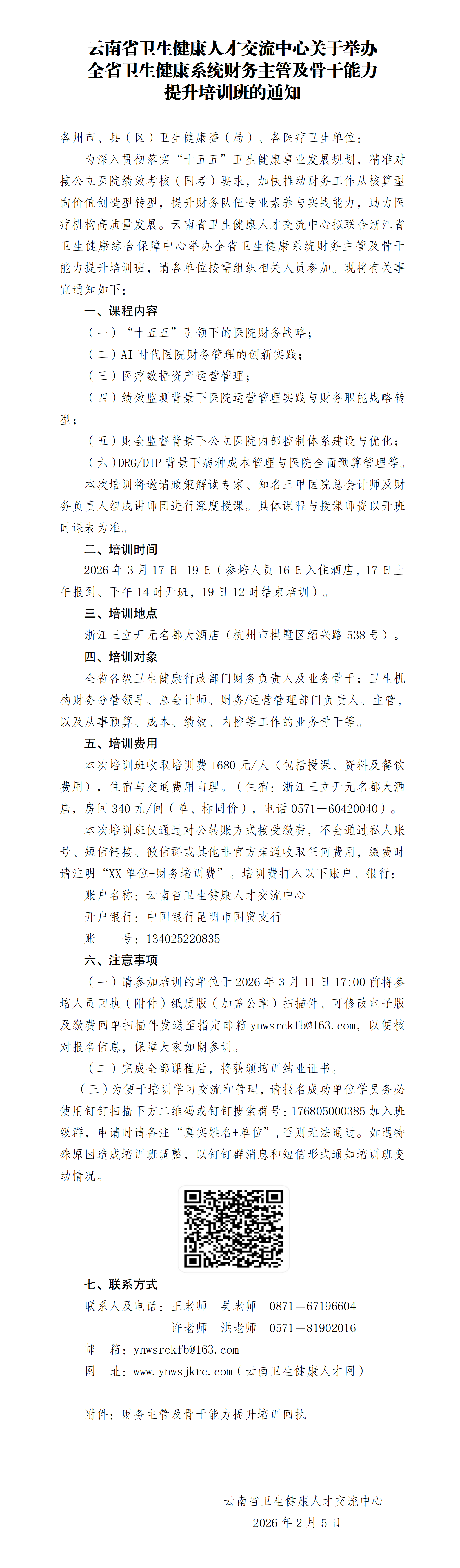 云南省卫生健康人才交流中心关于举办全省卫生健康系统财务主管及骨干能力提升培训班的通知
