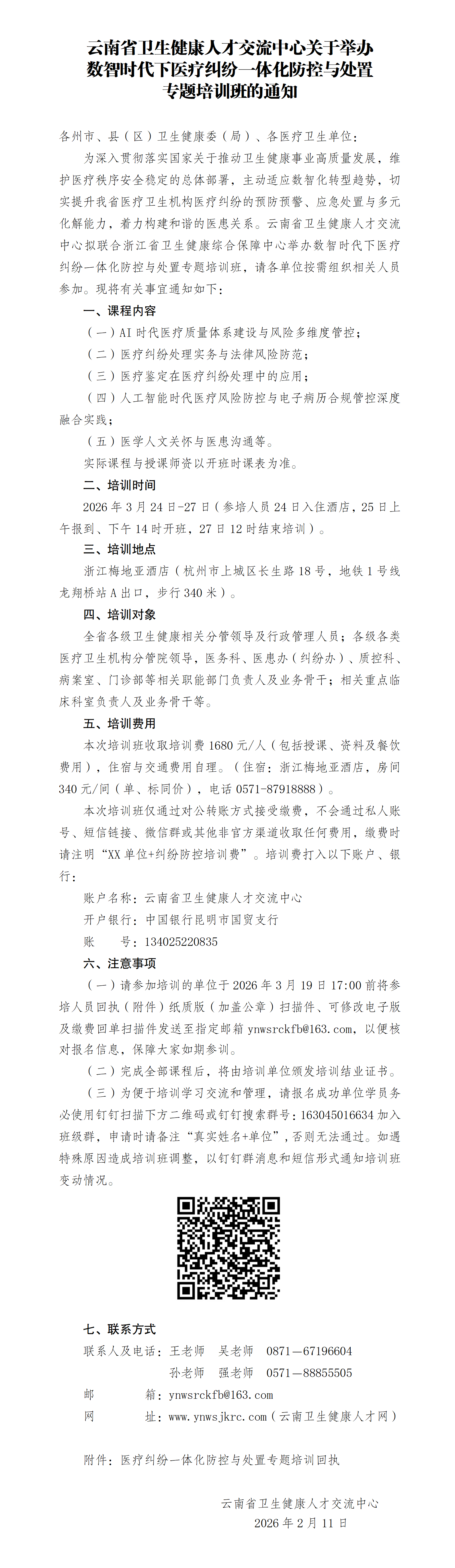 云南省卫生健康人才交流中心关于举办数智时代下医疗纠纷一体化防控与处置专题培训班的通知