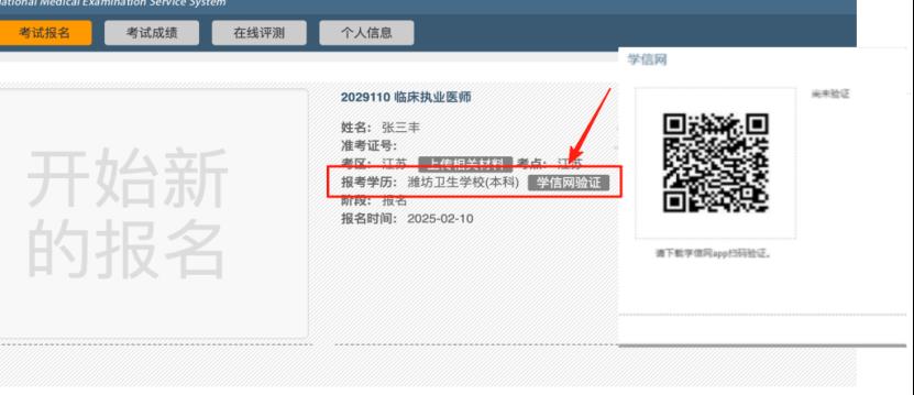 2.点击“学信网验证”灰色按钮进行学信网扫码验证/更新。(往年曾学历验证通过的考生,若未显示“学信网验证”灰色按钮,则不需要进行验证。)