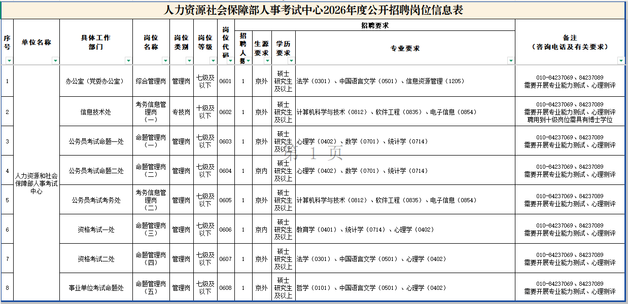 人力资源社会保障部所属单位2026年度公开招聘已经开啦!考试中心今年将招聘8个岗位,欢迎大家积极踊跃报名!