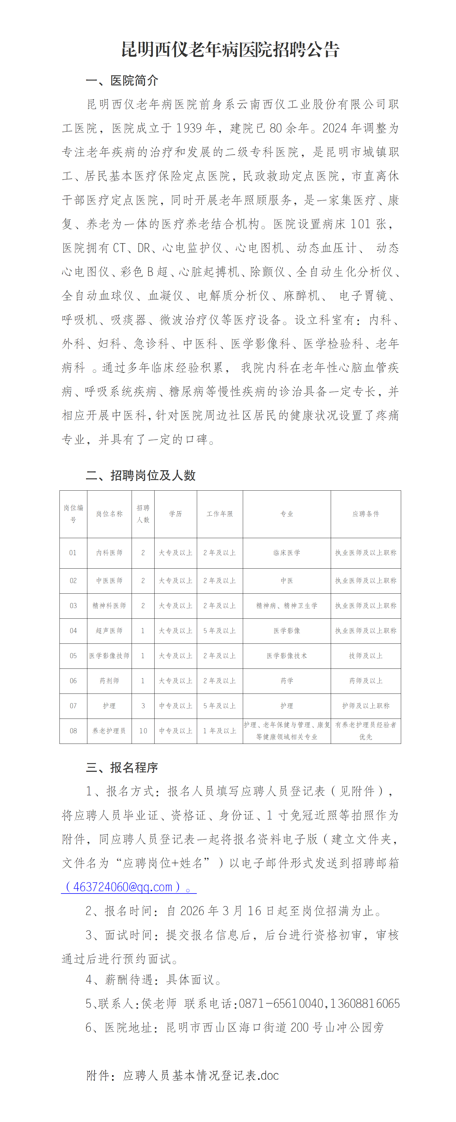昆明西仪老年病医院招聘公告