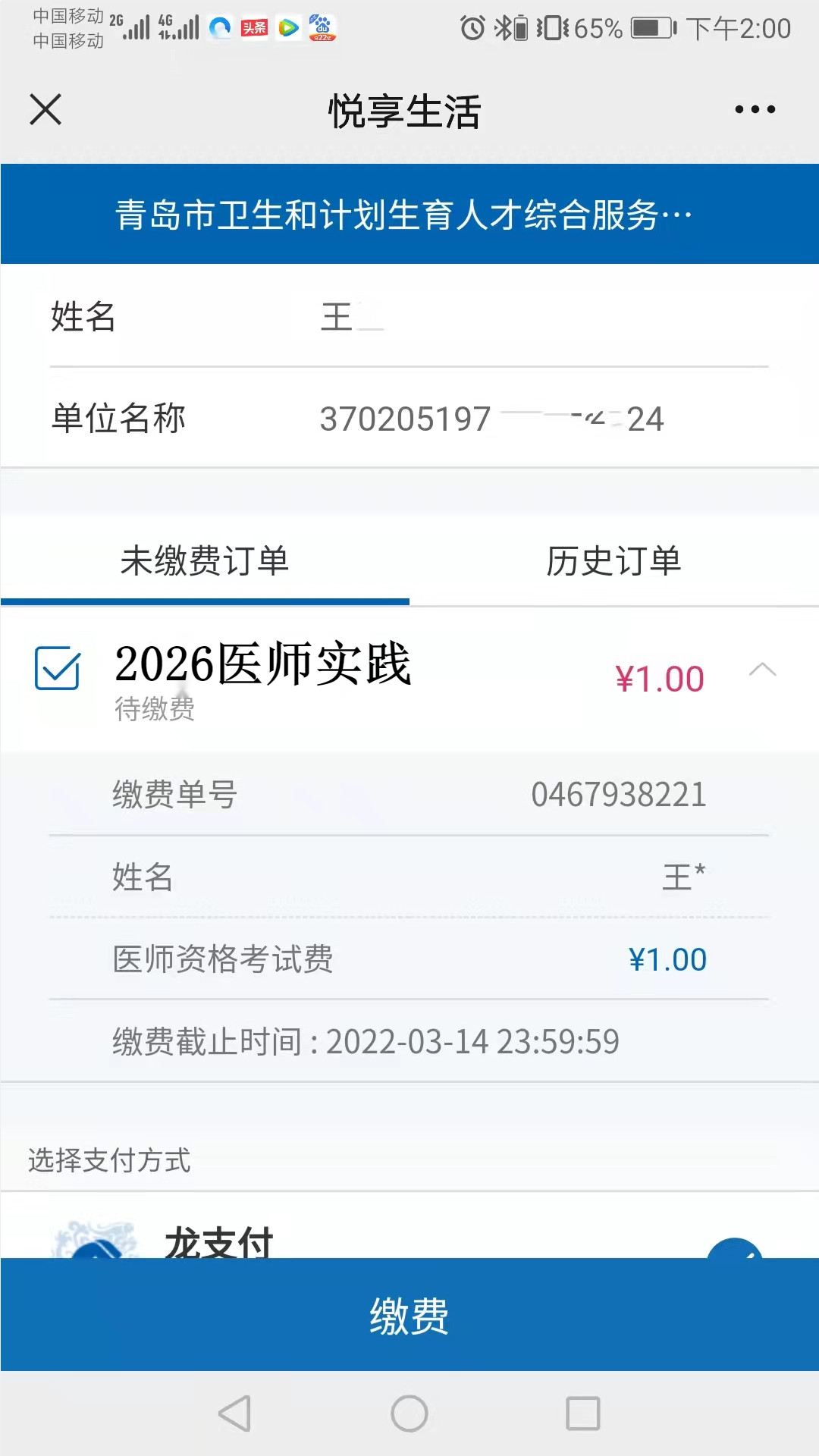 3.青岛考点考生缴费成功后可在建设银行“云平台”查到缴费记录,国家医学考试网不提供缴费查询服务。
