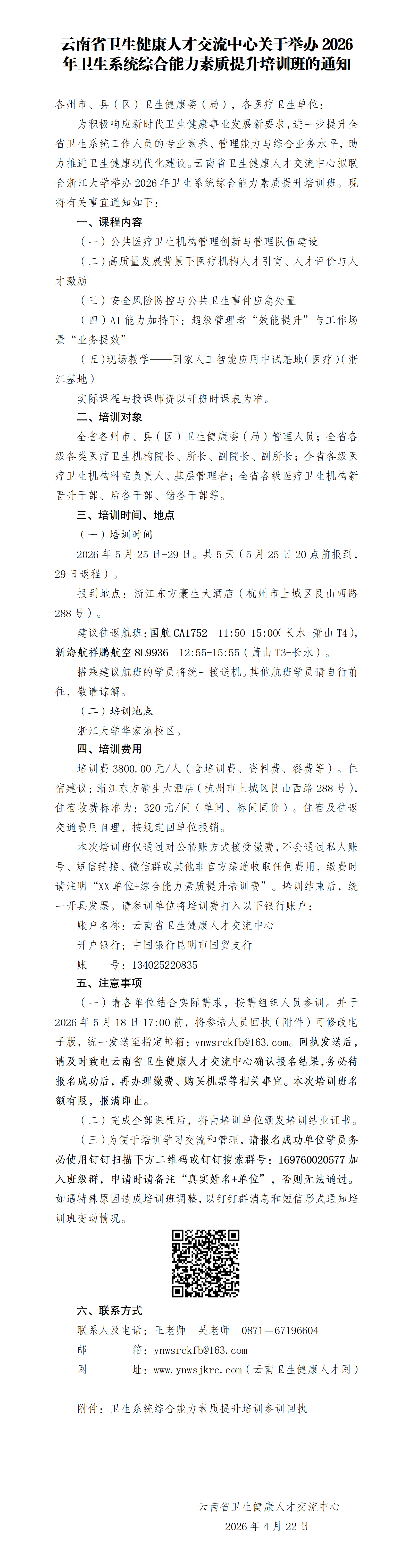 云南省卫生健康人才交流中心关于举办2026年卫生系统综合能力素质提升培训班的通知