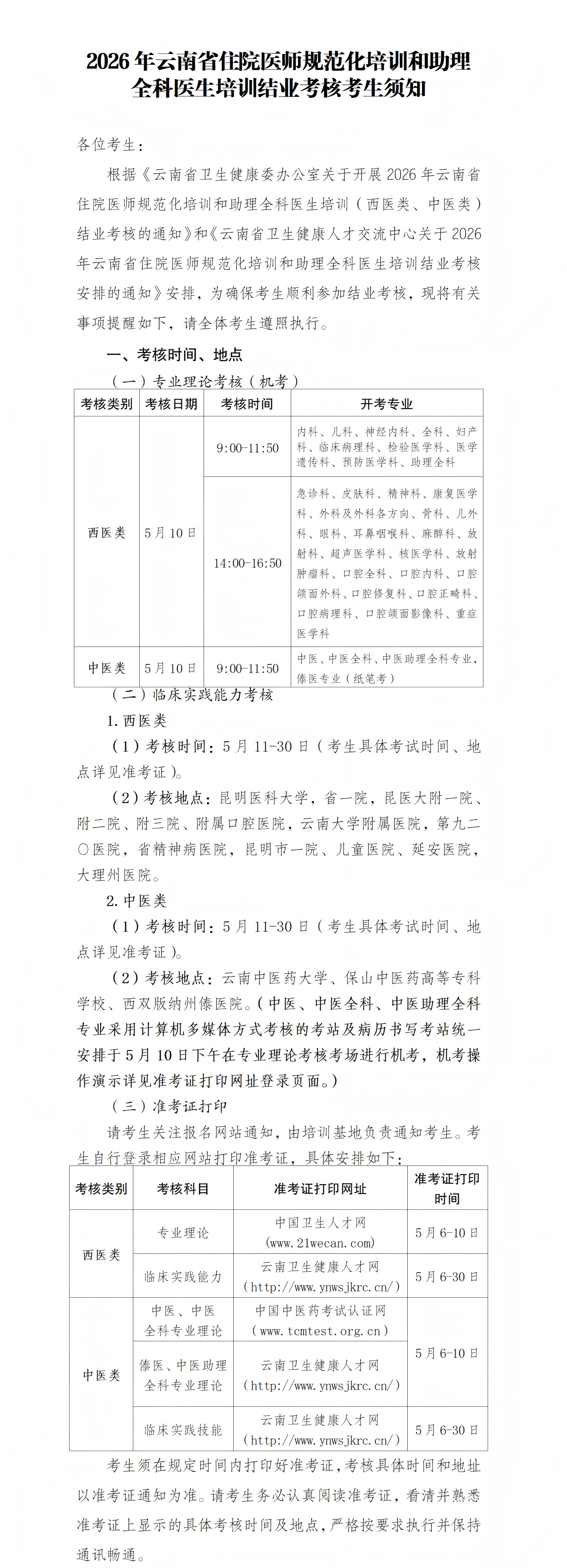 2026年云南省住院医师规范化培训和助理全科医生培训结业考核考生须知