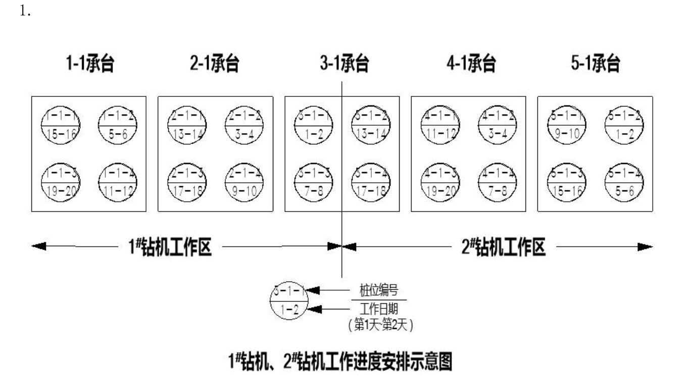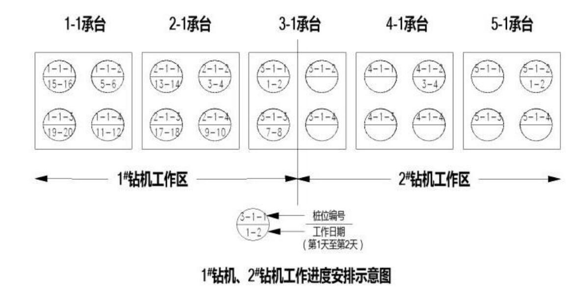 事件一:项目部依据工程地质条件,安排 4 台反循环钻机同时作业,钻机工作效率(1 根桩/2d)。在前 12 天,完成了桥台的 24根桩,后 20 天要完成 10 个承台的 40 根桩,承台施工前项目部对 4 台钻机作业划分了区域,见图 4—3,并提出了要求:①每台钻机完成 10 根桩;②一座承台只能安排1 台钻机作业;③同一承台两桩施工间隙时间为两天。1#钻机工作进度安排及 2#钻机部分工作进度安排如图 4—4所示。