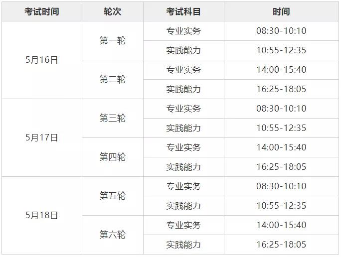 考试分为6轮次进行,每半天为一个轮次,考生将随机分配至其中一个轮次参加专业实务和实践能力两个科目的考试,具体参加考试时间以准考证为准。