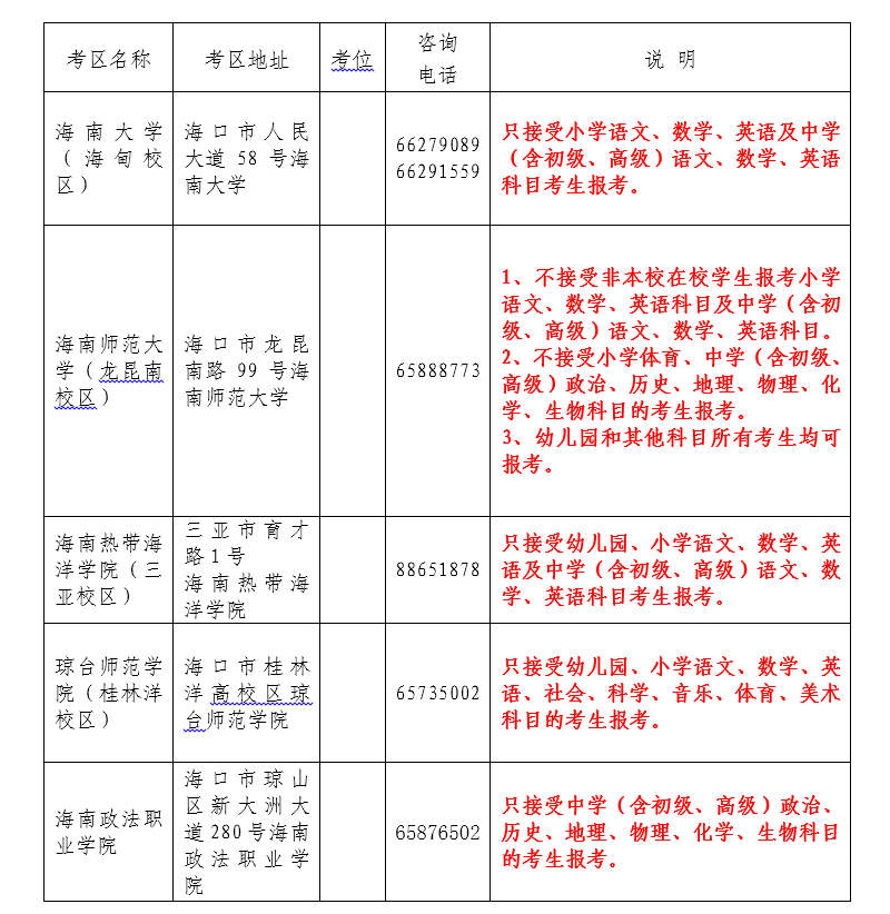我省2019年下半年中小学教师资格考试面试共设海南大学(海甸校区)、海南师范大学(龙昆南校区)、海南热带海洋学院(三亚校区)、琼台师范学院(桂林洋校区)和海南政法职业学院五个考区,报名结束后各考区根据实际报名情况设置考点,考生参加考试的考点名称与地址以准考证上的为准。现将考区信息公布如下: