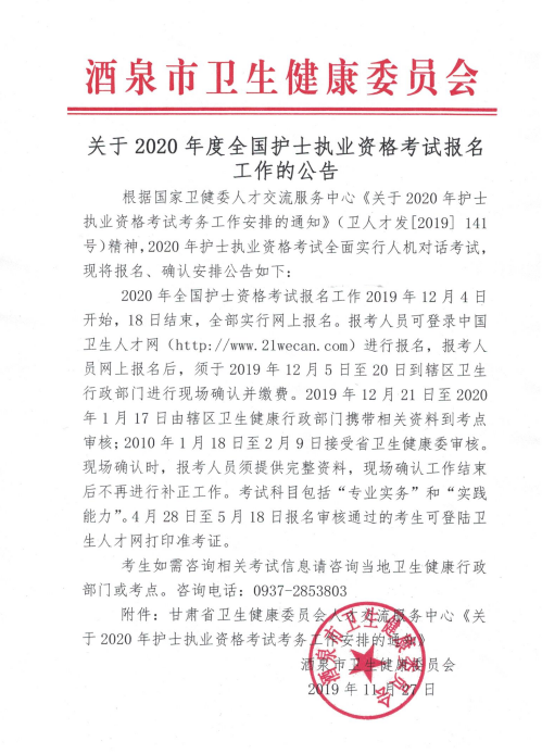 2020年酒泉市关于护士执业资格考试考务通知