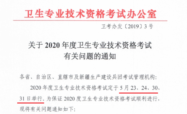 2020年卫生专业技术资格考试定于5月23、24、30、31日举行。