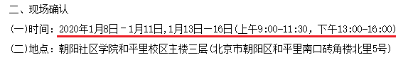 朝阳区妇产科主治医师考试报名现场确认时间为2020年1月8日–1月11日,1月13日—16日(上午9:00-11:30,下午13:00-16:00)