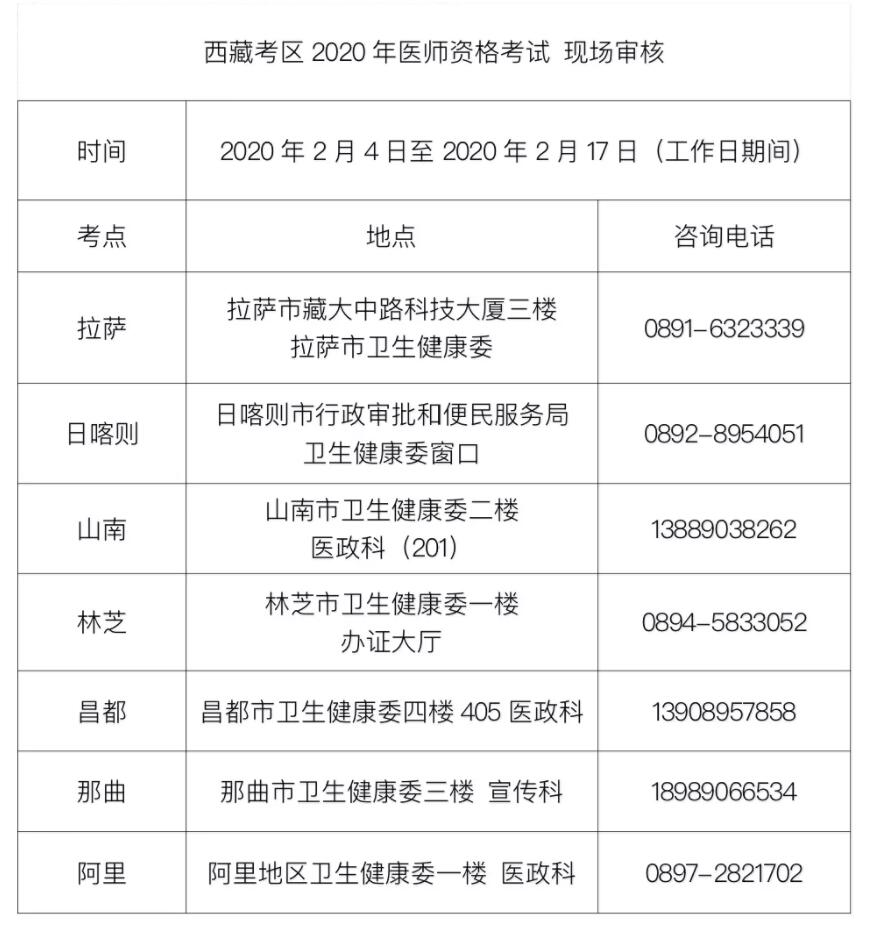 西藏2020年执业医师现场确认时间为2020年2月4日至17日,主要是对网上报名考生的照片采集和报名资料的真实性进行审核。具体现场审核咨询地点及联系方式如下: