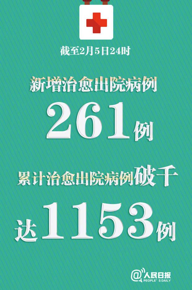 好消息!!!全国已有千名病例治愈出院,2月5日0~24时,新增治愈出院病例261例。截至2月5日24时,累计治愈出院1153例。相信一定会有一个接一个好消息传出来。