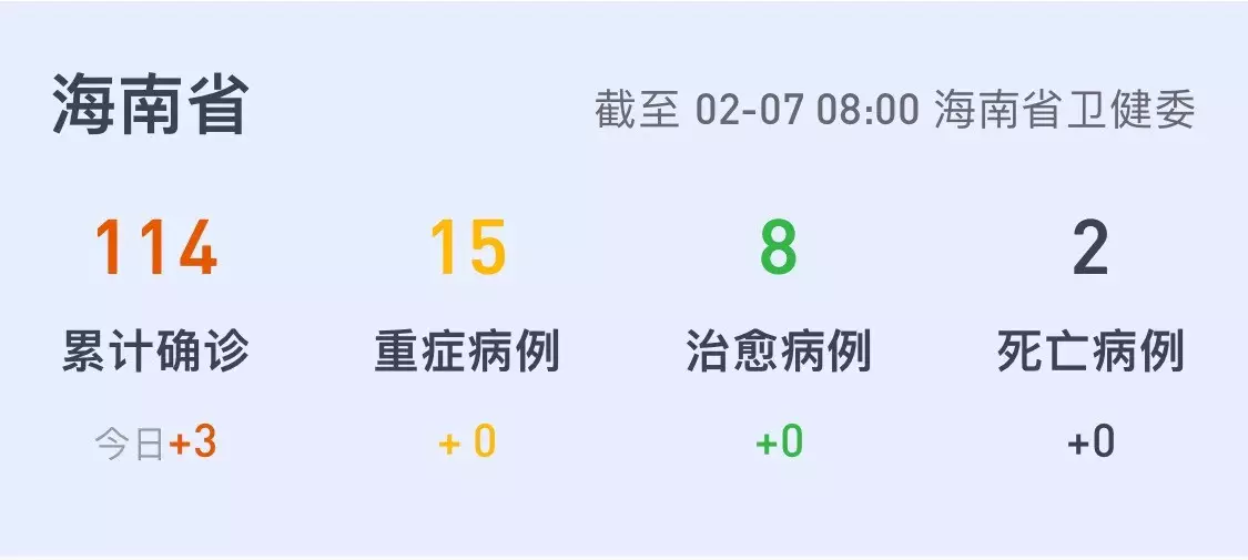 海南省卫生健康委员会网站公布的最新数据显示:截至2月7日8时,海南累计报告确诊病例114例。