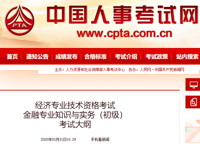 中国人事考试网发布2020年初级经济师《金融》考试大纲