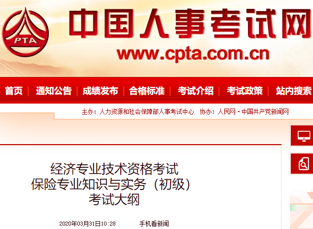 中国人事考试网发布2020年初级经济师《保险》考试大纲