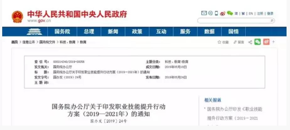 5月24日,国务院印发《职业技能提升行动方案(2019—2021年)》的通知。