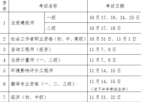 根据新冠肺炎疫情防控进展情况,经商有关部门,原计划于今年上半年举行的2020年度注册建筑师等职业资格考试,调整至今年下半年举行;原计划于10月31日、11月1日举行的2020年度经济专业技术资格考试(初、中级),调整至11月21、22日举行。具体安排如下: